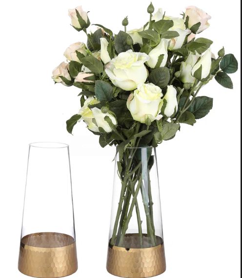 The combination of transparent glass and shimmering gold creates a captivating contrast, making these vases a beautiful way to showcase fresh flowers, greenery, or decorative stems. Whether placed on a dining table, kitchen counter, bookshelf, or office desk, these vases add a timeless charm and a contemporary flair to your space.